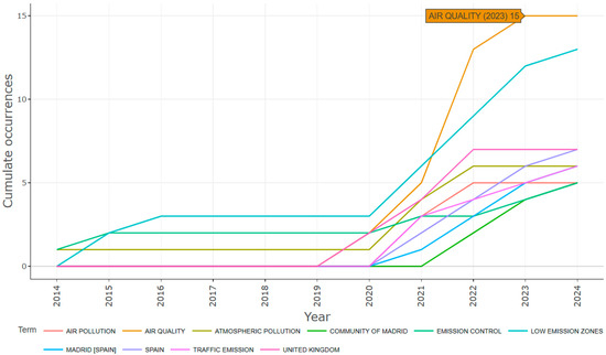 Among the analyzed articles, the Keywords Plus (i.e., words or phrases that frequently appear in the titles of an article’s references but do not appear in the title of the article itself) with more occurrences is “air quality” (15), followed by “low emission zone” (13), “Spain” (7), and “United Kingdom” (7). When the frequency is analyzed over time (Figure 4), a significant evolution of the term “air quality” can be seen, especially from 2020 onwards. The growth of “air quality”, surpassing “air pollution”, seems to be a consequence of the implementation of (or the intention to implement) “low emission zones” since the term “air quality” implies a comparison with air pollution standards.