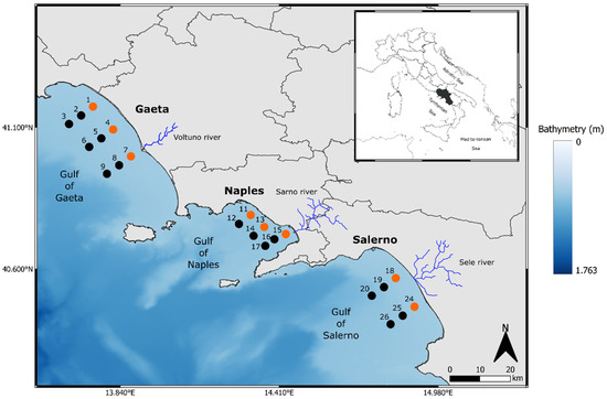 Study area (Campania region) and sampling stations. Orange circles represent inner shelf stations (<20 m depths), and black circles represent mid shelf stations (50–150 m depths).