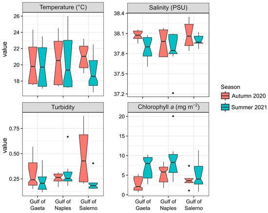 The environmental conditions, defined by temperature, salinity, turbidity, and chlorophyll a, appeared to be significantly different between the inner and mid shelf stations (p < 0.001) in both seasons. Only during the summer did significant differences emerge among the three gulfs, particularly between the Gulf of Naples and the Gulf of Salerno (p < 0.01).
