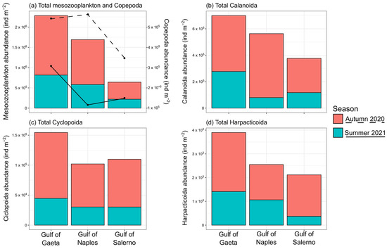 Bar plot showing the total abundance (ind. m−2) during autumn (in red) and summer (in blue) of mesozooplankton and copepods (a), where the dashed lines refer to the total abundance of copepods in autumn 2020 and the solid lines to summer 2021. (b) Total abundance of Calanoida, (c) Cyclopoida, and (d) Harpacticoida.