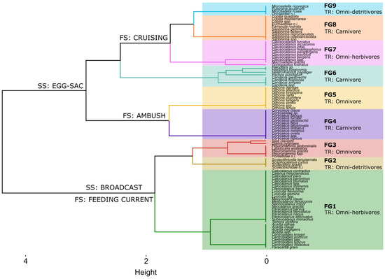 Functional dendrogram obtained from hierarchical clustering using Ward’s method, showing nine functional groups (FGs) of the 95 analyzed copepod species (FS: Feeding Strategy; TR: Trophic Regime; SS: Spawning Strategy).
