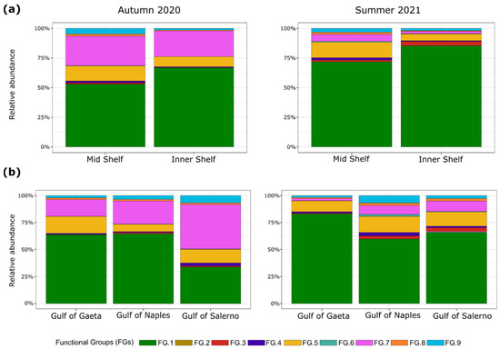 Bar plots of the relative abundance (%) of nine functional groups (FGs) found through cluster analysis, during the autumn and summer seasons at the mid and inner shelf stations (a) and in the three gulfs (b).