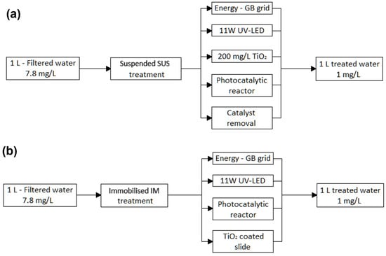 System boundaries for the (a) suspended SUS and (b) immobilised IM photocatalytic processes.