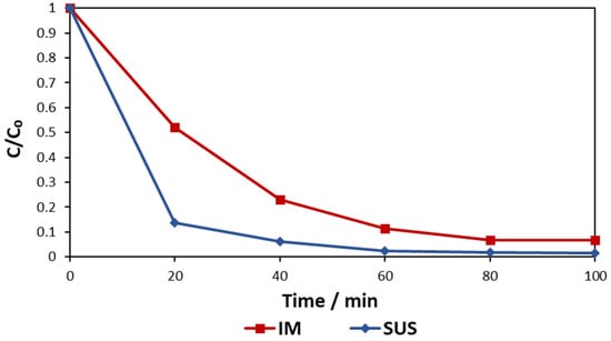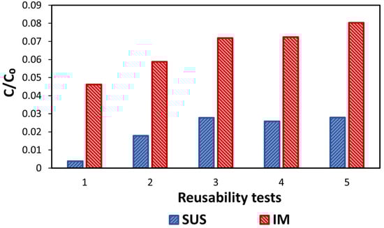 To further explore the amount of the catalyst that could be consecutively used for NOM photocatalytic treatment, reusability tests were carried out. Estimating the reusability of the catalysts enabled the assessment of the viability of these catalysts in an industrial process. The results, as shown in Figure 4, suggest that the NOM removal was slightly decreased by about 3% after the first three consecutive reusability tests and remained almost unchanged after this. Nevertheless, in both cases, the removal of NOM was very high and remained practically unchanged after five consecutive tests, which indicates that there is no need to replace the catalyst, either IM or SUS, for the first 500 min (8.3 h) of photocatalytic treatment. Hence, it was decided that the lifetime of the catalysts for the LCA could be assumed as 500 min.