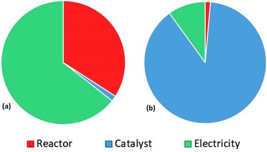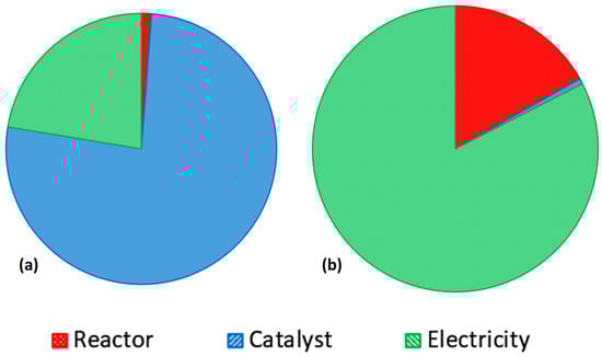 Percentage contributions of the reactor-, catalyst-, and electricity-related components of the (a) SUS and (b) IM photocatalytic processes to the environmental impacts.