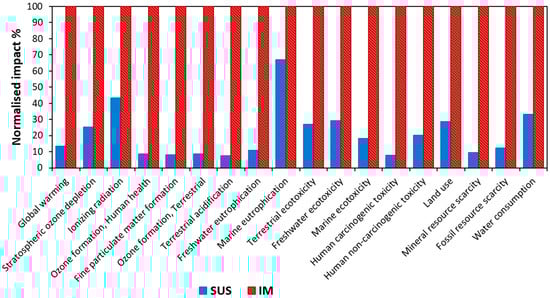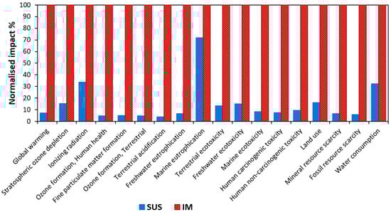 The ReCiPe characterisation model (midpoint-oriented indicators) was used to calculate the contribution of each factor to the 18 midpoint impact categories. Figure 6 shows the normalised midpoint results when comparing the SUS and IM processes for the treatment of surface water. The main findings at the midpoint level show that SUS is more environmentally sustainable than IM, with SUS having at least a 55% lower impact than the IM in all categories except one, specifically marine eutrophication. The contributions to this category had a 33% lower impact on SUS compared to IM. The marine eutrophication category relies on the assumption that marine ecosystems tend to be limited by nitrogen. It uses a simplified nitrogen air fate and transport assumption that 70% of the nitrogen inputs into surface freshwater ecosystems make their way to coastal waters.