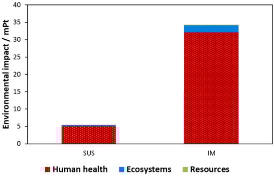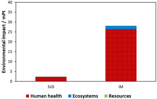 Single score output from ReCiPe 2016 impact assessment comparing SUS and IM cases.