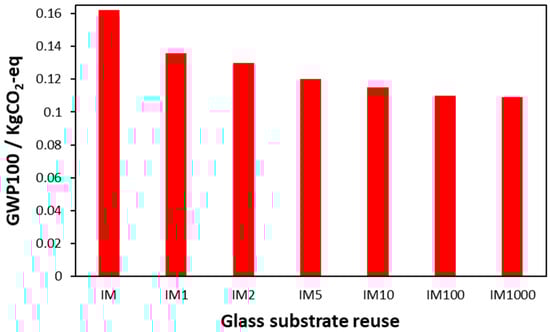 The results in Figure 11 show the GWP as a function of the number of times that the glass substrate was reused. A significant reduction in environmental impact was observed when comparing the lack of glass reuse with IM1 and IM2, which yielded 0.136 kg CO2eq and 0.130 kg CO2eq, respectively, which represents about a 16% decrease in carbon emissions from IM after a single reuse. This significance in impact reduction quickly decreased as the reuse frequency increased, with IM10 and IM100 producing 0.115 kg CO2eq and 0.11 kg CO2eq, respectively, and IM1000 producing 0.109 kg CO2eq in carbon emissions, a 4.3% reduction from IM10 to IM100. Therefore, it can be inferred that reuse produces diminishing returns with a 0.9% reduction in carbon emissions when increasing the reuse frequency from IM100 to IM1000. It is at this point that the contribution of the glass is no longer a significant contributor to the carbon emissions produced by treating the system unit. This can be seen in Figure 11, which shows the IPCC GWP100 fossil contributions from each reuse case considered in this scenario. This figure shows that the percentage contribution of the catalyst for the IM series of processes started at 76.36% when no glass was reused in catalyst production, which then dropped to 71.94% for IM1 and finally to 64.89% for IM1000. This figure suggests that gaining at least 10 extra uses from the glass before it is broken or no longer usable would largely negate the medium’s environmental impact.