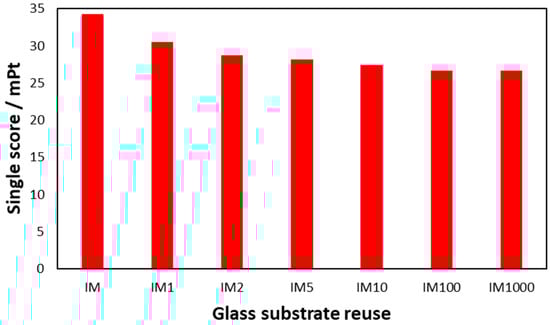 Single score output from ReCiPe 2016 impact assessment comparing immobilised photocatalytic processes with various levels of glass reuse.