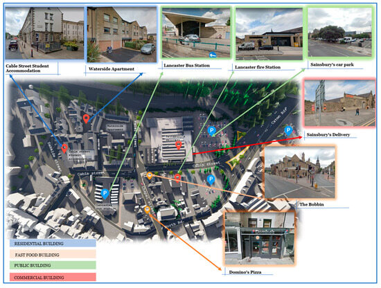 North end section of Lancaster City Centre and Location of Cable Street. Land Use Data for Lancaster City Centre from Google Maps. Retrieved on November 2021 from https://earth.google.com/web/@0,-0.2992002,0a,22251752.77375655d,35y,0h,0t,0r (accessed on 11 June 2020).