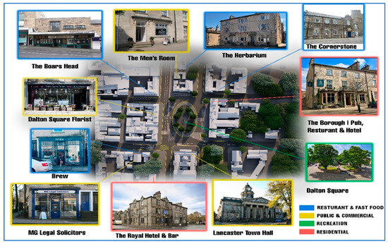 Inner Core of Lancaster City Centre and Location of Dalton Square. Land Use Data for Lancaster City Centre from Google Map. Retrieved November 2021 from https://earth.google.com/web/@0,-0.2992002,0a,22251752.77375655d,35y,0h,0t,0r (accessed on 17 June 2020).