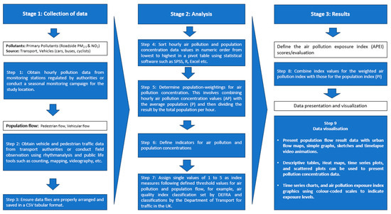 The key challenge is that individual exposure to air pollution in urban areas results from multifaceted interactions between humans and urban air, which are dependent on both the spatial–temporal dynamics of air pollution concentrations and the individual’s activities [34]. Consequently, each individual has a unique personal exposure to air pollution during their everyday life, due to their space–time activity patterns [35]. Thus, quantification is not straightforward, given the unavailability of corresponding information on pollution and population dynamics [18,36,37]. There is a need to investigate air pollution exposure in urban areas using real-world real-time changes in pollution levels and population dynamics across different timescales.