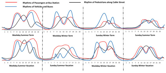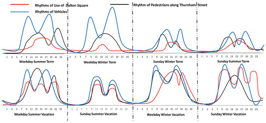 Figure 4 shows the seasonal rhythm of people and vehicle flows along Cable Street and the bus station following Lancaster University’s and the bus operator’s timetable’s temporal classifications. The data suggest public use of Cable Street during a typical weekday in the summer term, which spans from the Easter holiday to the end of the academic year in July [93,94], starts at 04:30 when the bus station opens, and ends at 00:00 when it closes during term time. Traffic peaks occur from 08:00 to 11:00 and 15:00 to 19:00, with a significant morning rush at 08:00 due to the opening of businesses, offices, and educational establishments in Lancaster. Passenger and bus traffic at the station also peaks at this time. After 10:00, commuting declines, but pedestrian traffic increases, peaking at 13:00. Evening activity heightens again until around 18:00, with a notable peak at 21:00 when retail outlet, restaurant, and bar closures commence.