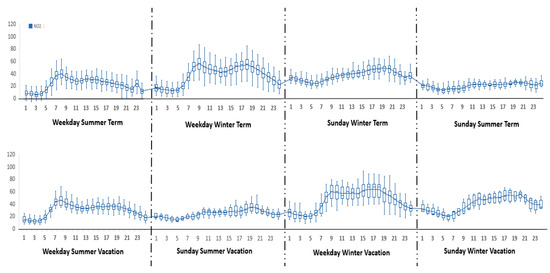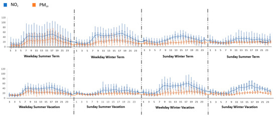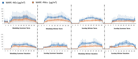 Winter vacation sees increased pollution due to festive activities and higher levels of vehicle traffic, with weekday peaks at 09:00 and 18:00, and weekend peaks aligning with increased city centre activity, declining after 18:00. Compared to summertime, winter weekday morning NO2 and PM10 concentrations (Figure 5) increase from 05:00 and increase from 09:00 to 11:00 on weekends. Peaks at 09:00 and 18:00 on weekdays and 17:00 on weekends align with the city centre activity patterns described earlier. While NO2 and PM10 gradually increase from 05:00 to 12:00 on winter and summer vacation weekdays, weekends show a contrast, resembling winter term with increased levels from 08:00 to 20:00. Pollution levels are higher in the mornings and evenings on weekdays and throughout the day on weekends.