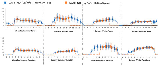 This study uses hourly average NO2 and PM10 concentrations from the monitoring station co-located with the Central Bus Station on Cable Street and on Thurnham Street’s side of Dalton Square from January 2015 to January 2019 (www.ukairquality.net (accessed on 16 June 2020)). Cable Street and Dalton Square exhibit elevated NO2 levels, often surpassing UK objectives, and particularly high PM10 levels compared to other pollutants. To understand the different patterns and rhythms of air pollution within the study locations across different timescales, 5-year average hourly NO2 and PM10 concentrations were calculated for Cable Street for each day of the week for winter, summer, university term time, and non-university term times, and then compared to NO2 concentrations at Dalton Square for the pre-defined periods.