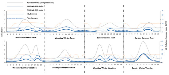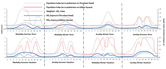 We define a novel exposure index by combining traditional atmospheric, social, and behavioural science elements with rhythmanalysis. This use of indices to assess or communicate environmental quality or risk is not new in the UK and other countries [65,66]. The UK currently compares air pollution levels with the Environmental Performance Indicators classifications for air quality. In summary, air pollution indices typically base their values on ambient air quality concentration levels and associated health implications, with few exceptions, considering factors like population exposures. For example, [67,68,69,70,71,72,73] defined population-weighted exposure by either weighting their air pollution index to a given population and/or the health response of a city or region. However, they all have limited consideration of spatial and temporal dynamics defining individual exposure, failing to capture local variations in population dynamics, hotspots, and changing exposure patterns. In Lancaster, the focus has mainly been on measuring air pollution and comparing it to UK AQ standards to understand its impact on residents’ health. Hence, we emphasize the need to consider the intersectionality of social rhythms, space, and design, as neglecting the spatial–temporal distribution of the population leads to significant misclassification. It is crucial to acknowledge that people are not static but rather move from one place to another, which previous investigations have ignored.