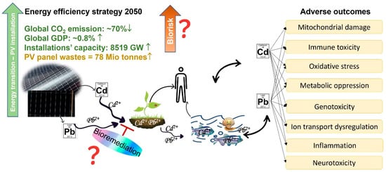 Potential release pathways of cadmium and lead from solar panels into the environment, including their environmental entry points, targets, and associated adverse effects. Cadmium and lead, released directly or indirectly from solar panels, can penetrate the environment. They may accumulate in soils, subsequently entering plants, or contaminate ground and surface water, further possibly accumulating in aquatic animals. As humans are at the top of the trophic chain, they may be affected by consuming exposed food, including vegetables, seafood, and freshwater fish. Implementation of bioremediation techniques can help reduce the potential negative impacts of released xenobiotics on the environment and living organisms. Numerical data come from www.irena.org (accessed on 19 June 2024), iea-pvps.org (accessed on 19 June 2024), ise.fraunhofer.de (accessed on 19 June 2024).