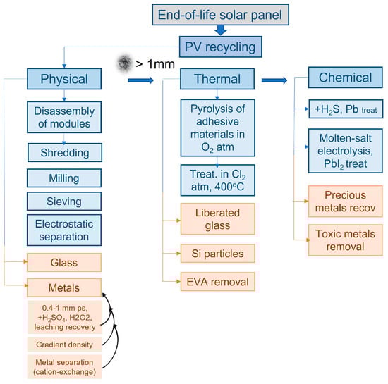 In contrast to conventional disposal methods, like landfills and incineration, for end-of-life solar cells, recycling offers significant economic and ecological advantages for their final disposal. Recycling techniques are typically categorized into physical and chemical methods (Figure 2), with contemporary approaches often combining both for comprehensive material recovery []. Physical processes involve initial the disassembly of modules to extract the aluminum frame, followed by shredding to obtain a powder. This powder is then subjected to heavy medium separation to separate glass and metals from the polymer. Metals can be recycled, as an example, using gradient density techniques, with various densities of NaCl/Na polytungstate of 1.2 g/cm3, 1.3 g/cm3, 1.4 g/cm3, and 1.5 g/cm3 employed for effective separation []. Pagnanelli et al. (2017) proposed a method involving crushing and screening waste solar panels and then dividing them into fractions based on particle size []. Glass recovery from particles sized 0.4–1 mm was direct, while larger particles required heat treatment to remove EVA. Metals were predominantly concentrated in particles smaller than 0.4 mm and were recovered using a leaching process with sulfuric acid and hydrogen peroxide, achieving a final product recovery rate of 91% []. A comparable method using sulfuric acid and hydrogen peroxide effectively extracted both cadmium and tellurium from CdTe thin-film panels, followed by their separation using cation-exchange resins [].