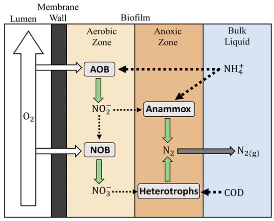 The Anammox process can be integrated with other innovative technologies such as membrane-aerated biofilm reactors (MABR) to provide an ideal environment for simultaneous nitrification and denitrification (SND) biological reactions [,,]. For Anammox–MABR systems to thrive, the four groups of bacteria (AOB, Anammox, NOB, and denitrifying bacteria) must coexist. The expected biofilm profile (Figure 1) consists of an inner aerobic layer to support AOB and NOB growth and an outer anoxic layer to support Anammox and denitrifying bacterial growth []. The nitrogen gas produced by both Anammox bacteria and denitrifying bacteria helps to maintain low dissolved oxygen (DO) concentration or anoxic conditions in the bulk solution.