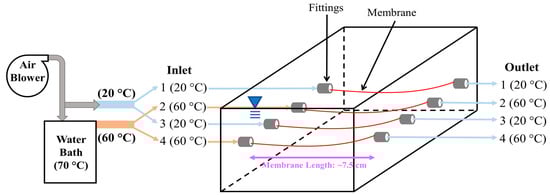 The membranes used in the Anammox–MABR system are polymeric hollow fiber membranes designed for oxygen transfer. A lab-scale Anammox–MABR operating under a partial nitritation–Anammox process (PN-A) was constructed using 4 membrane fibers, each 7.5 cm long (Figure 2). It should be noted that all 4 membrane fibers were placed in a single and well-mixed reactor (600 mL) so that the experimental variable (air temperature) can be emphasized in the reactor operation. The preferred length of the membrane in the Anammox–MABR system was determined to be less than 10 cm from the results of a preliminary MABR system (Figure S1 and Table S1) [Section S1, see Supplementary Information]. Air at two different aeration temperatures was supplied through the membranes of the Anammox–MABR system: 20 °C (ports 1 and 3) and 60 °C (ports 2 and 4). The air was maintained at the desired temperature by directing air flow through copper tubing in a heated water bath kept at a constant temperature. The tubing from the water bath to the reactor was insulated to minimize the heat loss in the tubing.