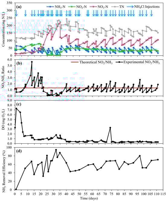 (a) Nitrogen concentrations, (b) comparison of theoretical and experimental nitrite-to-ammonia molar ratio, (c) dissolved oxygen concentration, and (d) ammonia removal efficiency for Anammox–MABR performance throughout the 111-day operational period.