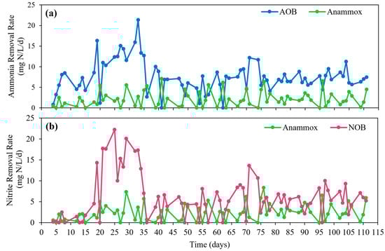 The daily nitrogen removal rate (mg N/L·d) by each specific bacterial group (AOB, Anammox bacteria, NOB, and denitrifying bacteria) can be estimated by deriving theoretical mass balance equations from Equations (1)–(4) [Section S2, see Supplementary Information]. Since no organic substrates were provided to the synthetic feed solution, the activity of denitrifying bacteria was assumed to be negligible.