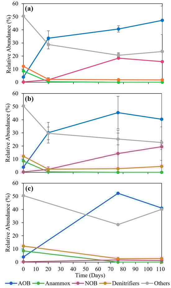The microbial communities from 16S amplicon sequencing were organized in five target bacterial groups of interest: AOB; Anammox bacteria; NOB; denitrifying bacteria; and others. The relative abundance for these bacterial groups of interest was compared for the two different aeration temperature conditions (Figure 5a,b) and the bulk solution (Figure 5c). The most abundant bacterial group in the biofilm was AOB at 20 °C and 60 °C, with an increasing relative abundance from 3.9% to 47.3 ± 10.9% and 40.4 ± 23.1%, respectively. For Anammox bacteria, the relative abundance in the biofilm decreased from 8.5% to less than 0.001% at both 20 °C and 60 °C, indicating a decrease in Anammox bacterial activity and a shift towards full nitrification with primarily AOB and NOB in the system. The low levels of Anammox bacteria detected by 16S amplicon sequencing analysis could also be due to poor amplification of the 16S rRNA gene with the universal bacterial primers []. For NOB, the relative abundance increased from 0.2% to 15.7 ± 8.9% (20 °C) and 19.81 ± 15.08% (60 °C). In comparison to both of the temperature aeration conditions, the relative abundance of AOB in the bulk solution was also highest (Figure 5c), indicating that AOB was dominant for both attached and suspended growth conditions with negligible repercussions. However, the relative abundance of NOB in the bulk solution was less than 2%, indicating that a majority of the NOB preferred to attach to the membrane, which supports a higher DO concentration in the aerobic biofilm. This suggests that the membrane’s oxygen transfer and air permeability resulted in the outgrowth of NOB in the biofilm compared to that in the bulk solution.