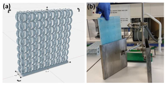 (a) 3D-printed flat filter of high surface area; (b) deposition of the final TiO2/P25 coating onto the filter.