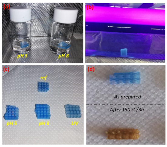 As described in Section 2.2, the lattices underwent physical testing, being subjected to unusually high levels of chemical (Figure 2a), irradiation (Figure 2b), and thermal stress to accelerate natural aging effects. As depicted in Figure 2c, it was determined that neither chemical stress (at pH 5 and pH 8) nor irradiation (UVA 365 nm) stress significantly altered the morphology and chemistry of the polymeric lattices. However, a slight color change observed under UV irradiation prompted us to decide on depositing a protective SiO2 layer beneath the photocatalytic TiO2 layer.