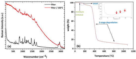 Subsequent examination of the vibrational properties via Raman spectroscopy revealed that the flat filters contained a Bisphenol-based epoxy resin (marked with an asterisk in Figure 9a), a commonly and widely used material in DLP 3D printing. However, additional modes were observed originating from additional monomers and/or the hardener present in the commercial resin solution [41,42]. Moreover, the SiO2 gel obtained from the dried SiO2 precursor solution exhibited the characteristic spectrum of the amorphous phase [43].