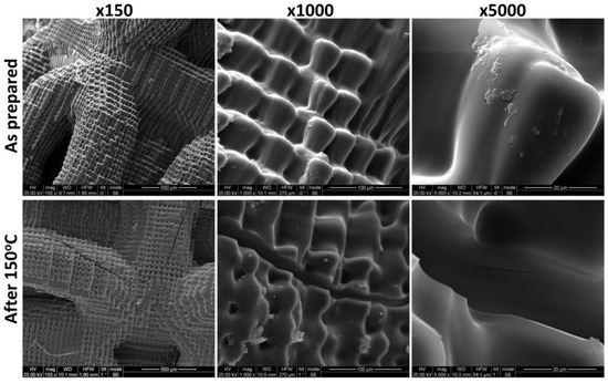 Furthermore, SEM was employed to observe the morphological features of the lattices both before and after the stress tests. Consequently, minor alterations on the polymer’s surface were noticed following immersion in solutions of varying pH. However, it cannot be definitively stated that the material remains unaffected after undergoing the thermal stress test. Specifically, although the initially prepared 3D-printed lattices exhibited a highly uniform and smooth structure (with any random grains possibly arising from the Au sputtering), localized cracks emerged after 3 h of annealing at 150 °C (Figure 4).