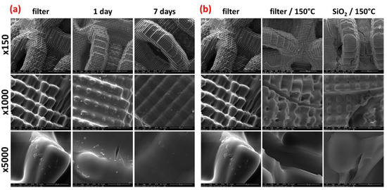 (a) The morphology of the SiO2 layer on the lattice surface, prepared using the dip-coating technique, after one- and seven-days of solution curing; (b) SEM images of the untreated and heat-treated lattice and the heat-treated SiO2-coated lattice.