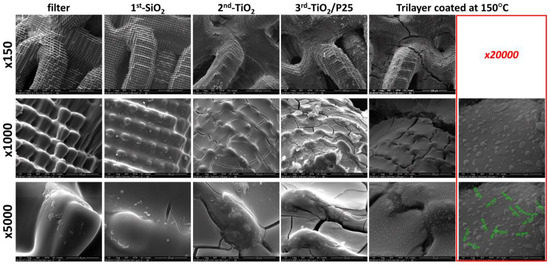 Subsequently, a comprehensive examination of the layer-by-layer coating morphology using SEM (Figure 6) confirmed the presence of a 3D honeycomb-like structure of the flat filters. Practically, the resolution capabilities of the 3D printer allow for the construction of the desired filter by printing micro-sized “bricks” (with dimensions of 16 μm × 16 μm × 34 μm) as the pattern for building blocks. As mentioned before, the subsequent application of the SiO2 layer resulted in a very uniform, homogenous, and smooth coverage, maintaining the initial surface roughness to a significant extent. Despite some minor imperfections that appeared on the surface, the high quality of the SiO2 layer ensures the efficient insulation of the polymeric substrate and improved adhesion of the top TiO2 coating. In addition, as can be observed, the substrate is completely covered by the thicker titania coating. The cracks in the TiO2 did not compromise the stability of the polymer, due to the insulation provided by SiO2. Upon adding Evonik P25 into the titania precursor solution, the coating morphology remains unchanged, except for the addition of white large grains incorporated onto the external surface. The P25 powder ultimately resulted in random grains ranging in size from 160 to 700 nm.