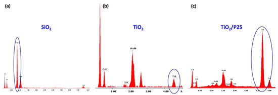 EDS spectra of coated 3D-printed flat lattice with the top (a) SiO2; (b) TiO2; and (c) TiO2/P25 layers.