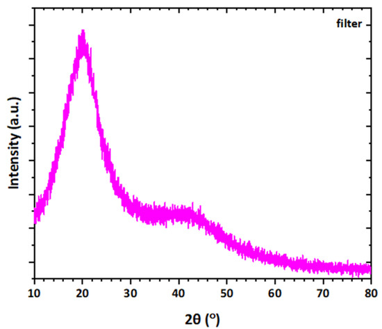 The XRD analysis of the lattices indicated that the polymeric matrix solely exhibited a broad diffraction peak at approximately 20° (Figure 8), a common characteristic observed in many polymeric materials. The absence of any SiO2 or TiO2 peaks suggests their uniform and high dispersion of coatings on the membrane surface. Another remark is that the XRD pattern did not exhibit any Bragg peaks associated with crystalline TiO2, likely due to the low TiO2 content, which could not be detected on the polymeric substrate. This outcome is favorable, indicating the formation of an ultra-thin TiO2 film. An ultra-thin film is advantageous as it maintains the high surface area of the photocatalytic filter and helps prevent an excessive pressure drop across its length.