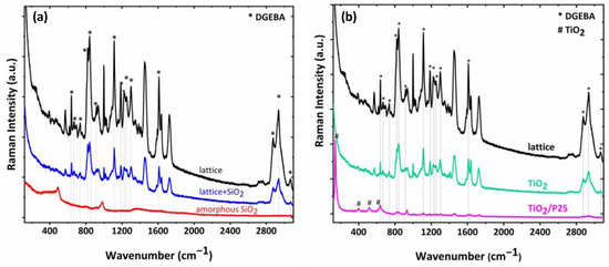 Consistent with the XRD findings, the deposited silica and titania modes were still undetectable (SiO2 is in an amorphous phase). However, it should be mentioned that these spectra showed a less intense signal compared to the reference (uncoated) lattice, suggesting that the presence of the additional SiO2/TiO2 layers on the lattice surface decreases the intensity of the scattered laser beam. In contrast, the Raman spectra of the TiO2/P25 modified lattice exhibited a markedly different pattern, as depicted in Figure 9b; the anatase crystal phase of titania predominated [44], attributable to the high concentration of the commercial P25 photocatalyst, while traces of the most intense epoxy resin modes remained detectable.