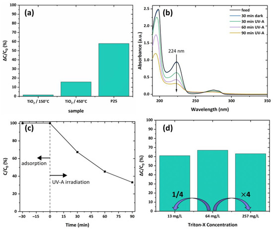 (a) Removal of Triton X-100 at a concentration of 13 mg/L using nanoparticulate TiO2 powders (catalyst amount: 1 g/L) with UV-A exposure for 30 min (natural pH); (b) evolution of the Triton X-100 UV absorbance at a concentration of 64 mg/L in the supernatant aliquot; (c) study of the kinetics of Triton X-100 (64 mg/L) photocatalytic degradation with TiO2/P25 thin film on the lattice substrate (natural pH); (d) photocatalytic performance of trilayer-coated lattice as a function of Triton X-100 concentration under UV-A exposure for 90 min (natural pH).