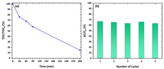 (a) Removal of total organic carbon (TOC) content during the photocatalytic process (UV-A irradiation, catalyst amount = 1 g/L, 64 mg/L pollutant’s concentration, natural pH, 25 °C); (b) final rejection of Triton X-100 (%) due to photocatalytic degradation by the modified lattices under UV-A illumination for 90 min, after five successive cycles (initial concentration = 64 mg/L, natural pH, 25 °C).