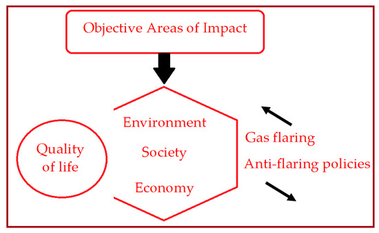 The quality of life is objectively mapped to the three pillars of sustainability (environment, society, economy), as distinct perspectives [18]. Gas flaring increases the negative impacts on the three pillars and, thus, on the quality of life. Effective anti-gas flaring policies reduce the negative impacts on the three pillars of sustainability and, thus, on the quality of life.