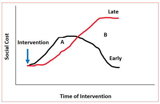 Total social cost of the introduction of gas flaring (summation of costs of damage due to the introduction of gas flaring and the costs of anti-gas flaring measures) versus the intervention time (early versus late); Area A (social cost of early intervention) versus Area B (resulting later benefits of the early intervention). Adapted from [21].