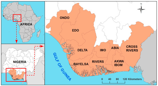The geographic focus of this study is the Niger Delta in Nigeria (Figure 3 [23]). The region is in southern Nigeria, consists of 9 political states situated off the Gulf of Guinea (Figure 3), with an official projected population (in 2022) of 44,731,900 [24] (20.6% of the total population of Nigeria), and has an area of 111,043 km2 [24] (12% of the total area of Nigeria). This is the largest delta in Africa and the third-largest globally [25]. Nigeria is the largest oil producer in Africa [26], with most of the oil production carried out from oil wells in the Niger Delta, which also accounts for 70% of the total hydrocarbon reserves in sub-Saharan Africa [27]. The gas flaring problem is particularly acute in this region, with hundreds of gas flare sites emitting billions of cubic meters of associated gas per year and making Nigeria a globally high greenhouse gas emitter [28].