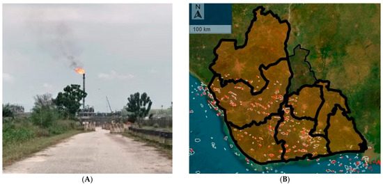 (A). A gas flaring site in Rivers State, Niger Delta. Notice the proximity of the flare site to vegetation. (B) Geographic representation of gas flare sites [red dots] within oil fields [white enclosures] in seven states in the Niger Delta (obtained from the Nigerian Gas Flare Tracker, which is operated by the National Oil Spill Detection and Response Agency (NOSDRA) [29]). Estimates for the seven selected states, between March 2012 and May 2024: 2.2 billion Mscf; 115.0 million tonnes of CO2 emissions; value of USD 7.6 billion of gas flared; potential penalties for flaring, USD 4.3 billion; power generation potential, 216.5 thousand GWh [29].