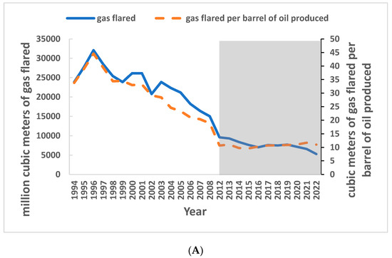 (A). Volume of gas flared compared with the intensity of gas flared. (B). Volume of gas flared compared with the oil production rate. The 1994–2008 gas flare data were adapted from [79]; the 2012–2022 gas flare data were obtained from the World Bank GFMR [70]. The 1994–2008 oil production data were adapted from the “Statistical Review of World Energy” [71]; the 2012–2022 oil production data were from the World Bank GFMR [70]. Consistent data from 2009–2011 were unavailable.
