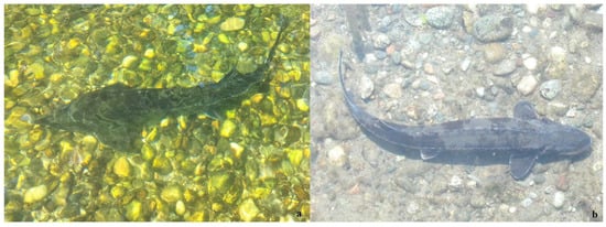Sturgeon (order Acipenseriformes, Berg 1940) represent one of the most important aquatic natural resources, both scientifically and commercially. With over 85% of species listed as endangered or threatened, sturgeon are considered the world’s most imperiled vertebrate group (IUCN 2022). All species are migratory, either anadromous or potamodromous. Typically, they are slow-growing animals, and they reach sexual maturity very late in life (aged up to 20 years), and some species do not spawn yearly [1]. Over the past century, sturgeon’ populations have been reduced by human-mediated alterations to riverine habitats, such as channelization, dam construction, and degradation of the water quality [2]. Specifically, to the North of Italy, Po River drainages into the Adriatic Sea have affected the beluga sturgeon (Huso huso Linnaeus, 1758) and the Adriatic sturgeon (Acipenser naccarii, Bonaparte, 1836), which have been recently assessed for the IUCN Red List of Threatened Species and were found to be Extinct in the Wild and Critically Endangered, respectively (IUCN 2022). Due to their long life cycle and anadromous behavior, they are very susceptible to overfishing, pollution, and habitat fragmentation [3]. A significant drop in catches began in the early 1920s, primarily as a result of overfishing and habitat fragmentation [4]. Recently, species reintroductions (i.e., the translocation of individuals to areas where a species has been extirpated with the aim of re-establishing a self-sustaining population) have become a widespread practice in sturgeon’ conservation biology [5], and this also contributes to the safeguarding of both beluga and Adriatic sturgeon [6].