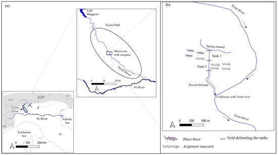 The mesocosm with sturgeon is located in Ticino Park along the Ticino River, a main Alpine tributary of Po River (Figure 2; [20]). The mesocosm consisted of two semi-natural communicating tanks. Each tank is bordered by grids, with natural bottoms and banks, each about 350 m long and 15 m wide. The tanks are mainly fed by a large natural spring channel and partly by small springs along the banks and on the bottom, and directly flowing into the Ticino River (around 2 km) (Figure 1). The depth of the tanks up to the river confluence does not exceed 1.6 m. In the upstream tank (tank 1), Huso huso is bred with a few juvenile individuals of Acipenser naccarii. In total, at the moment of sampling, there were around 30 H. huso individuals for an approximate total biomass of 700 kg. The A. naccarii juveniles were around 1000 individuals with an approximate biomass of 300 kg. Downstream (tank 2), divided by a grid, which impedes fish movements, about 400 adult individuals of A. naccarii (60–120 cm) are bred, with an approximate biomass of 1900 kg. In the system, a few trout and barbels were also present.