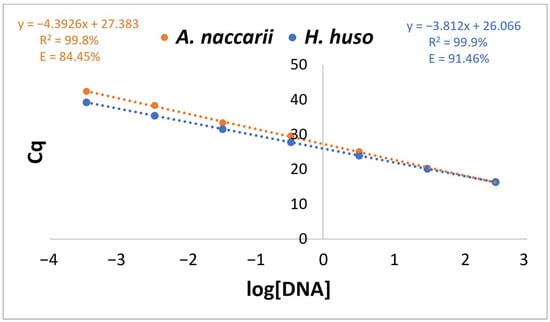The amplification efficiency of the A. naccarii primers was 84.5%. For the 10-fold serial dilution of A. naccarii DNA, the LOD was 340 × 10−6 ng/µL, with a mean cycle threshold value (Ct) of 43 (SD ± 0.17). The LOQ corresponded to a Ct = 37 (2.23 × 1016 DNA counts/µL of reaction) (Figure 3). The H. huso amplification efficiency was 91.5%. The measured LOD corresponded to 340 × 10−6 ng/µL, with a mean cycle threshold value (Ct) of 39 (SD ± 0.13) (Figure 3). The LOQ corresponded to Ct = 41 (7.33 × 107 DNA counts/µL of reaction) (Figure 3). R2 values were ≥99.8% for A. naccarii and ≥99.9% for H. huso (Supplemental Table S4).