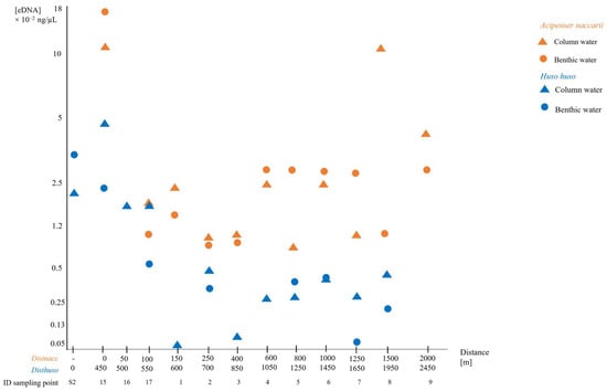 qPCR amplifications result for Acipenser naccarii eDNA assay (orange) and Huso huso (blue) across the range of DNA samples (cf Figure 2; Table 2). The average of the eDNA concentrations (six replicates each sample) for benthic water (circle) and column water (triangle) is plotted. On the x-axis, the distance (m) from the outflow of tank 2 (Dissnacc) and tank 1 (Disshuso) is indicated, alongside the ID of the sampling point (cf Table 2).