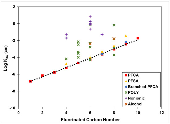 QSPR model to predict air–water interfacial adsorption coefficients (Kaw) for PFAS as a function of fluorinated carbon number. The data comprise a subset of data presented in Figure 1. Revised from Brusseau [9].