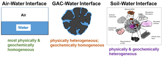 The range in complexity of environmental interfaces is illustrated in Figure 4, wherein three common interfaces are presented. The air–water interface is the most physically and geochemically homogeneous of the three, particularly in the absence of constituents accumulated at the interface. The surfaces of granular activated carbon (GAC) particles are physically heterogeneous while comparatively geochemically homogeneous. Finally, soils are comprised of many different components and, as a result, their surfaces are both physically and geochemically heterogeneous.