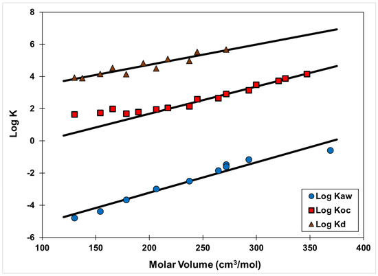 QSPR models for PFAS adsorption: (bottom data) at the air–water interface (Kaw), (middle data) by soils (Koc), and (top data) by granular activated carbon (Kd). Revised from Brusseau [20]. Regression equation for adsorption by soils and sediments: log Koc = 0.016 Vm − 1.6, r2 = 0.98; Regression equation for adsorption by GAC: log Kd = 0.013 Vm − 2.2, r2 = 0.89; Regression equation for adsorption at the air–water interface: log Kaw = 0.019 Vm − 7.1, r2 = 0.95.